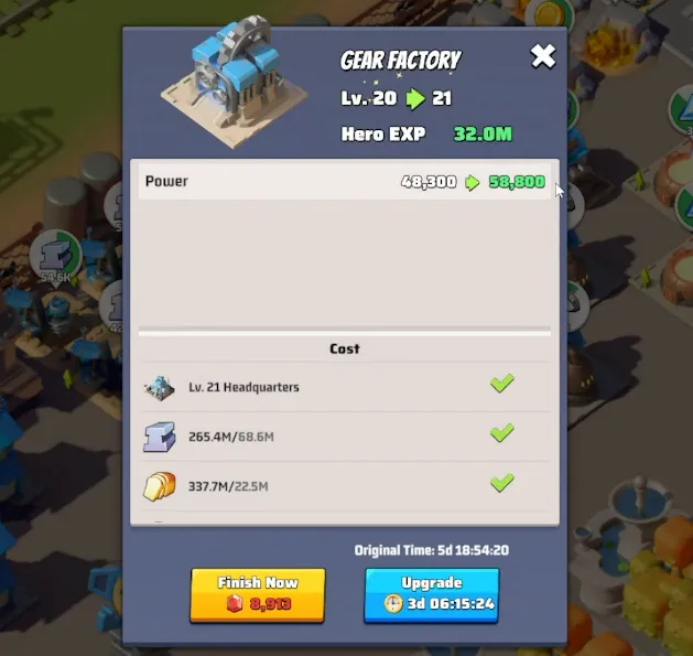 Leveling the Gear Factory past Level 20 provides almost zero benefit. It does not unlock better gear; it only gives a tiny amount of building power. Save your resources and builder time for your Headquarters and Tech Center.